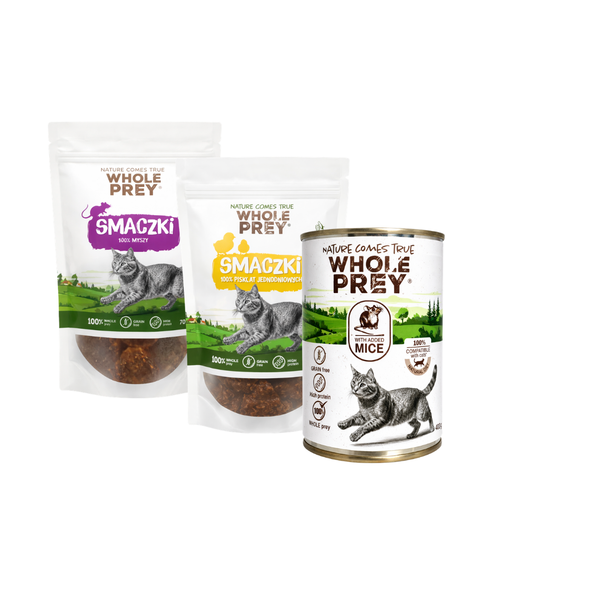 That is why our cat treats require no artificial flavours or palatants. WHOLE PREY treats always contain just one ingredient: 100% whole mice or 100% day-old chicks.